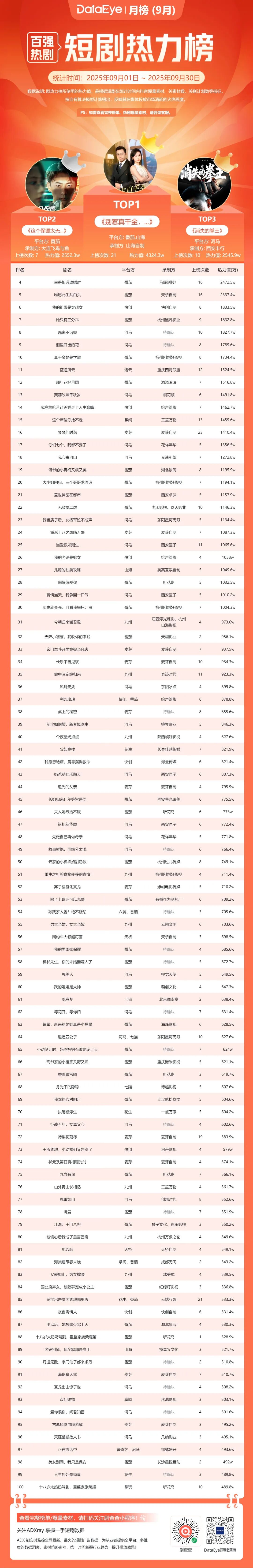 9月DataEye微短剧热力榜中,番茄,山海《别惹真千金,她爸是超级女儿奴》登顶,番茄《这个保镖太无敌了》第二,河马的《消失的拳王》位列第三。
