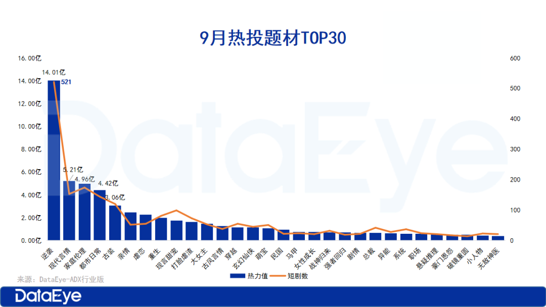 题材方面,本月有16种题材累计热力值超1亿,其中“逆袭”依旧是最火热的题材关键词,共关联了521部微短剧,热力值总值达14.01亿,在短剧数量和热力值上都较上期有所提升,短剧数增加了10部,热力值增加了2亿。