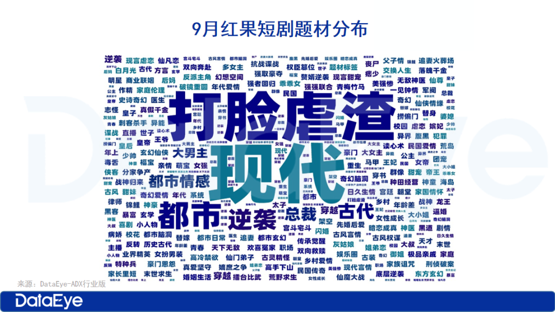 分析9月红果短剧的题材相关数据可以发现,9月前五名的题材均为:现代(265次)、打脸虐渣(229次)、都市(178次)、逆袭(158次)、古代(140次)。