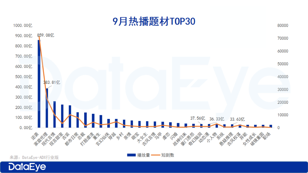 从题材上看,逆袭、家庭伦理、现言甜宠、都市日常、古装五大题材类型占据TOP5,其中“逆袭”题材遥遥领先。