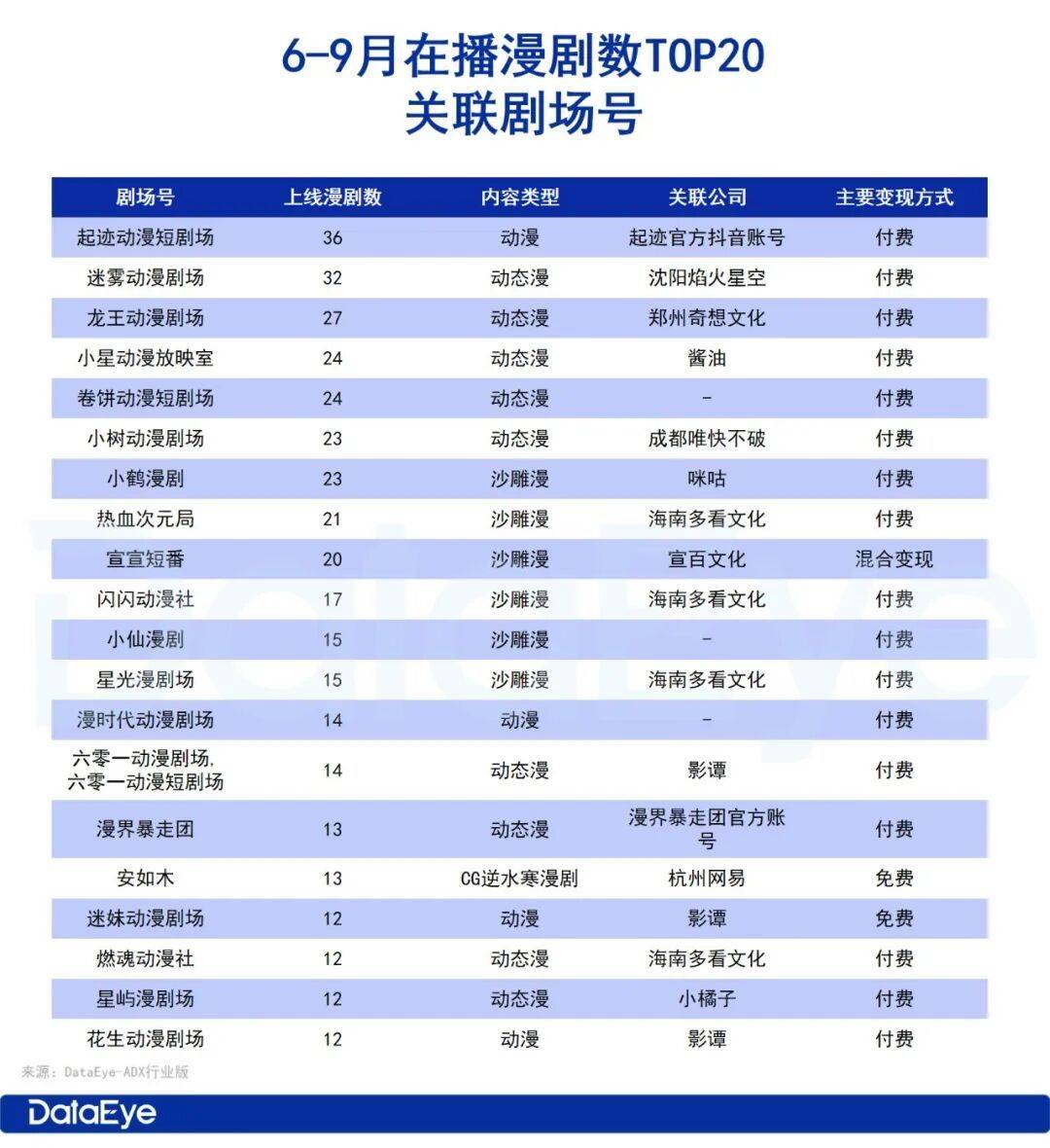 据DataEye-ADX数据,近4个月在播漫剧剧场号中,上线漫剧数量最多的是【起迹动漫短剧场】,共36部。沈阳焰火星空的【迷雾动漫剧场】紧随其后,共32部。整体而言,付费是漫剧剧场号的核心变现途径。