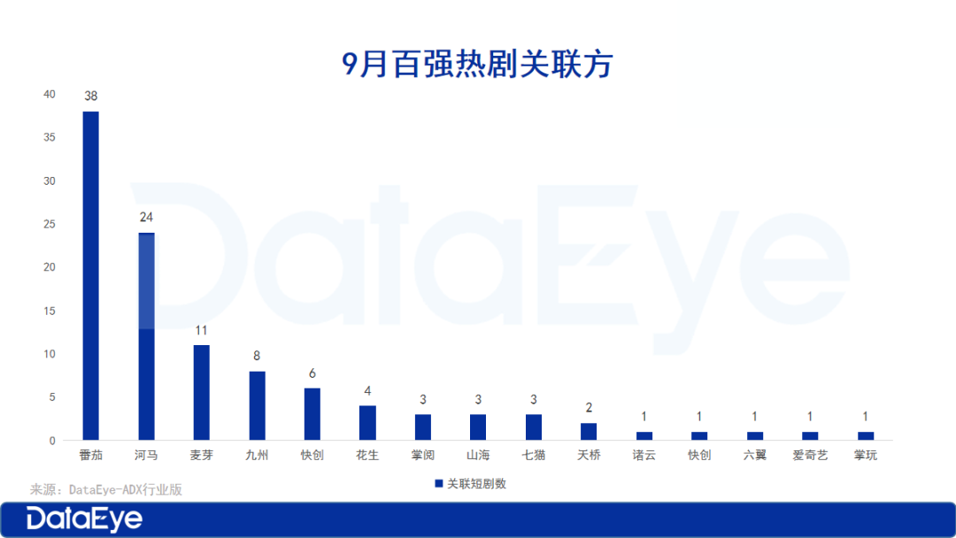 而从百强热剧的关联方来看,番茄遥遥领先,占38席,本期TOP5的微短剧中番茄占3席;河马位居第二,占24席;麦芽占11席,九州占8席,快创占6席。头部平台方呈现出明显的梯队分化趋势。