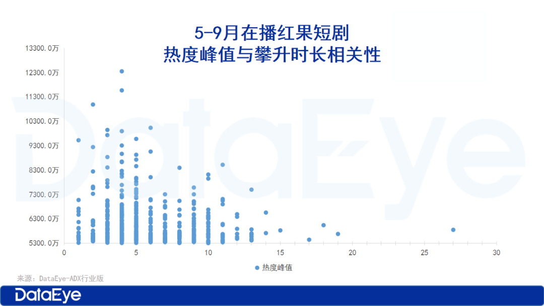 总体来看,攀升时长决定“爆款率”。从热度峰值与热度攀升的时长关系来看,部分超爆款短剧能够在5天内完成热度攀升。上榜热剧普遍能在10天内完成热度攀升,超出10天仍未突破7000万热度的微短剧可能面临淘汰风险!