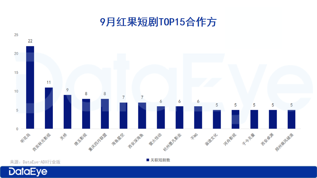 从合作方角度来看,9月红果短剧生态呈现头部集中化与策略差异化的双重格局。9月在榜短剧数最多的是听花岛,共有22部微短剧在榜;其次是西安秋元影视,共11部微短剧在榜;第三是西安秋元影视共9部短剧。