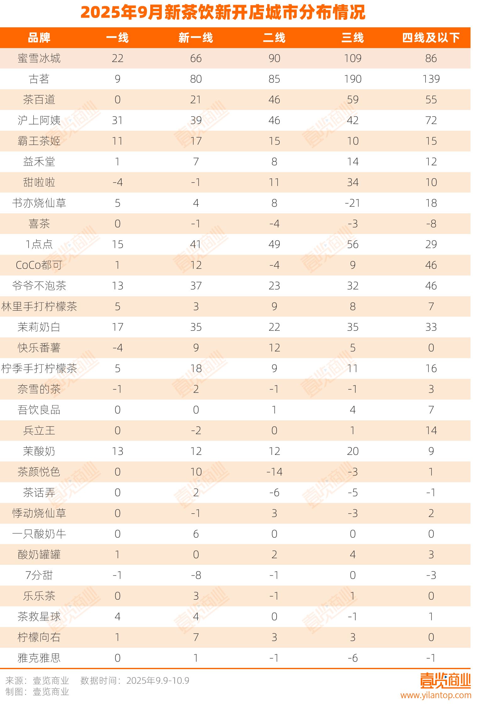 从结构来看,中腰部品牌回暖明显。1点点净增190家,环比增长4.87%,显示出加盟端的信心恢复;甜啦啦与益禾堂均实现约50家净增长,延续低速扩张节奏。另一方面,喜茶与奈雪的茶仍在主动瘦身,9月净减24家与6家。