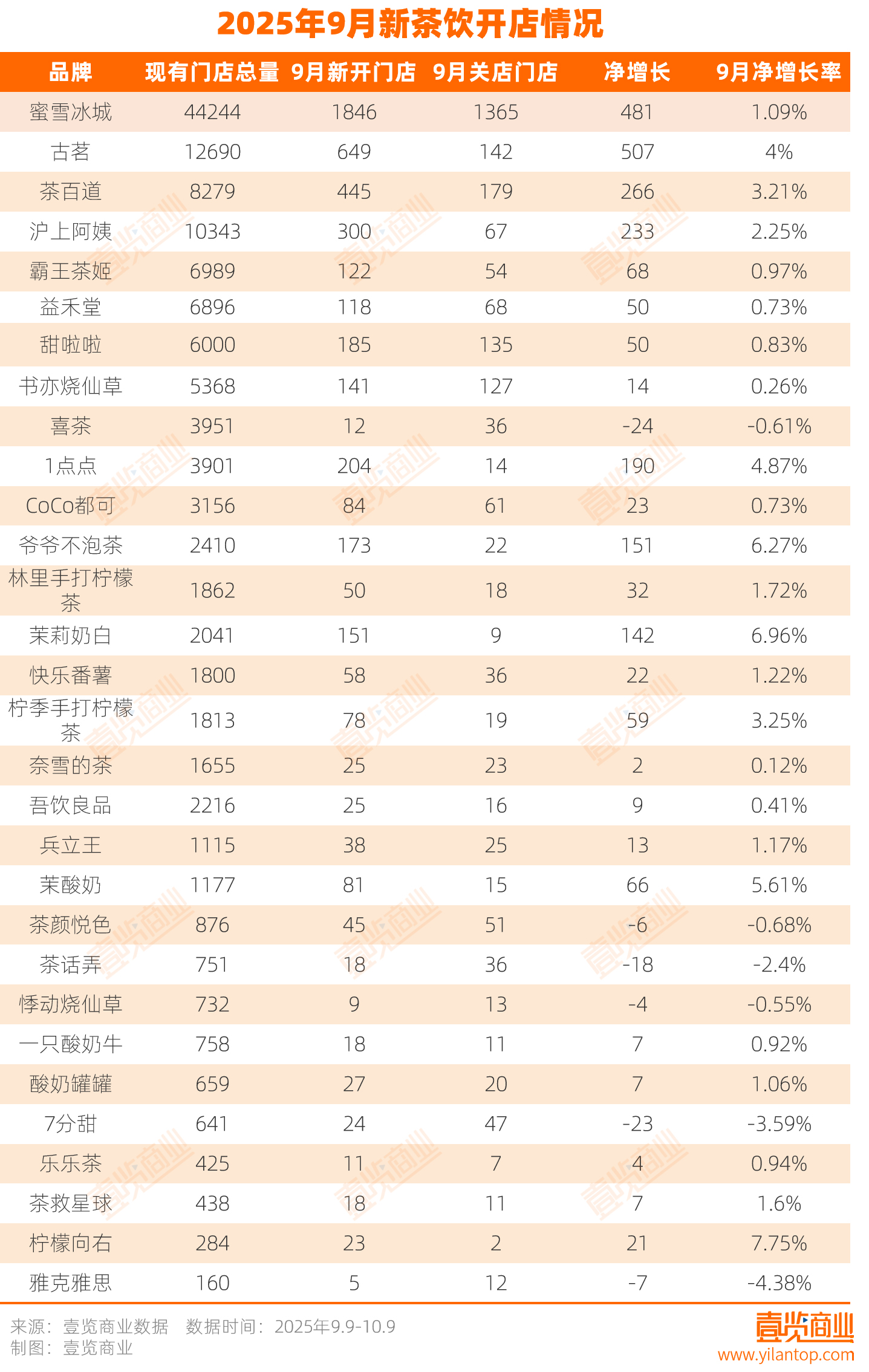 在规模层面,蜜雪冰城依然稳居龙头。其9月新开1846家、关店1365家,净增481家,总量突破4.4万家,保持约1.09%的月度增长率。紧随其后的是古茗,新增649家、关闭142家,净增507家,增长率达4%,成为9月净增最快的头部品牌。茶百道、沪上阿姨分别净增266家和233家,延续了上半年以来的稳健扩张节奏。