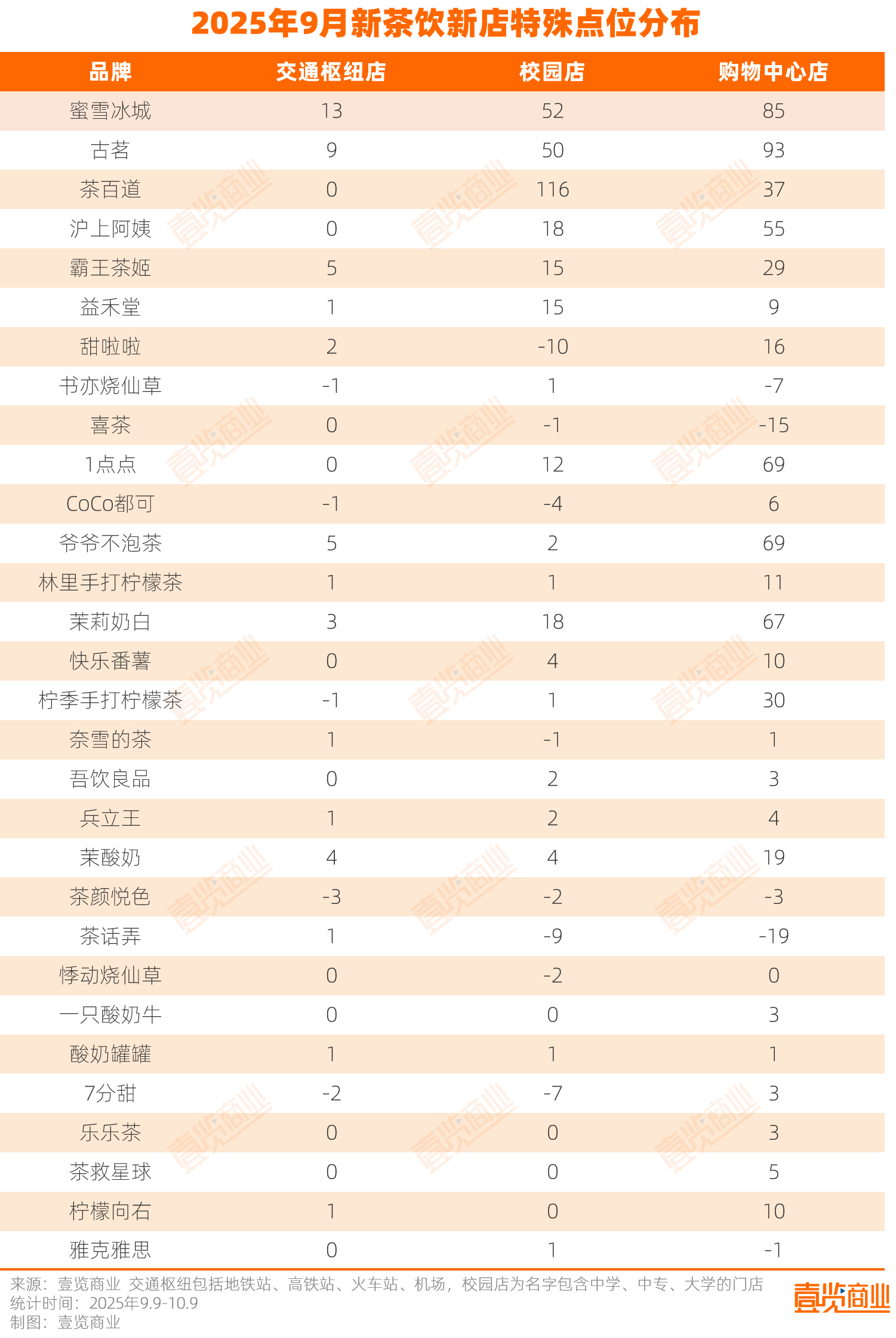 从9月的特殊点位分布来看,新茶饮品牌正在加速场景化布局。数据显示,校园与购物中心成为两大核心增长点。茶百道当月新增116家校园店,稳居行业首位;古茗、蜜雪冰城紧随其后,分别新开50家与52家校园店,凸显品牌对年轻消费力的重视。