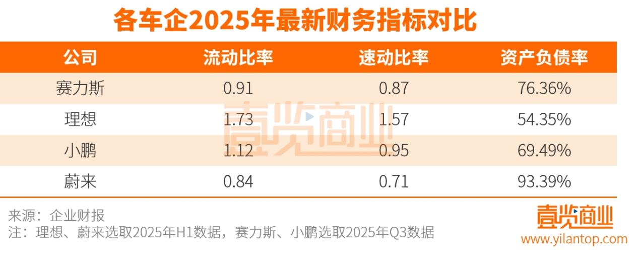 与此同时,赛力斯的流动性状况并不理想。2025 年第三季度,公司流动比率为 0.91、速动比率为 0.87,均低于安全线 1,也低于理想和小鹏这两家已进入稳定经营阶段的新势力。理想同期流动比率达到 1.73,小鹏为 1.12。从偿债能力看,赛力斯账面可快速变现的资产仍不足以覆盖短期负债,经营现金流必须保持在较高水平才能支撑日常资金周转,这意味着公司对销量、回款、经营节奏的依赖度远高于同行。
