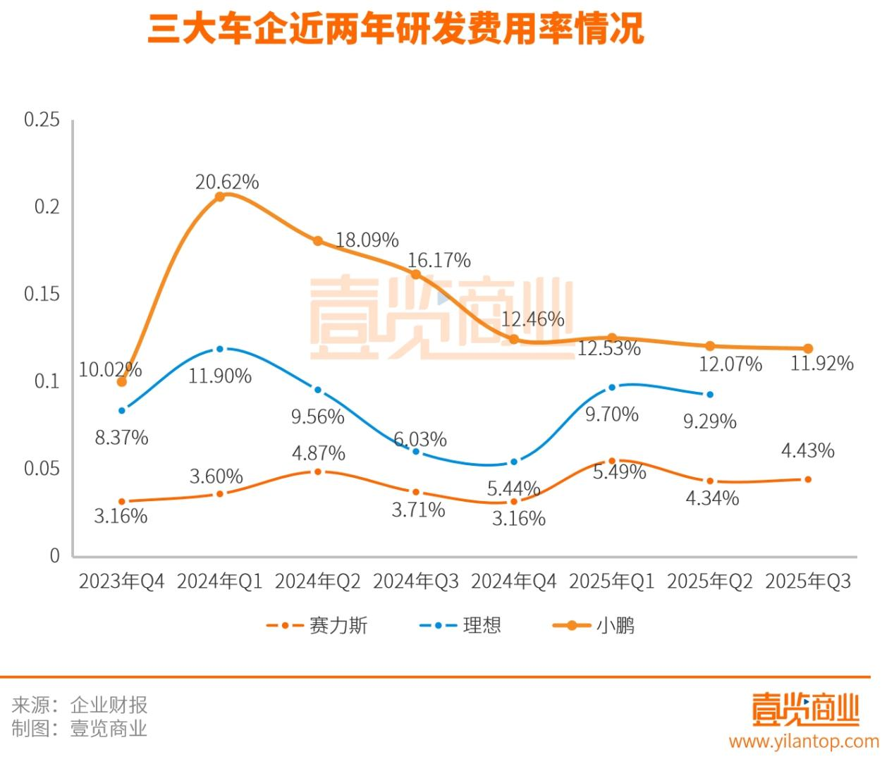 从研发费用率来看,小鹏最激进,2024 年1季度高达 20.62%,2025 年逐季回落到 12% 左右。理想保持在中位区间,2024 年一季度 11.90%,2025年保持在 9%—10% 之间。赛力斯最为谨慎,2023 年四季度仅 3.16%,2024—2025 年各季度基本在 3%—5% 波动,明显低于理想与小鹏。