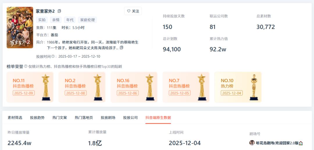 而从端原生播放量来看,《家里家外2》的表现也不逊色,抖音端原生累计播放量达1.8亿,12月8日更是以超4300W的单日播放增量跃居热播榜TOP2。