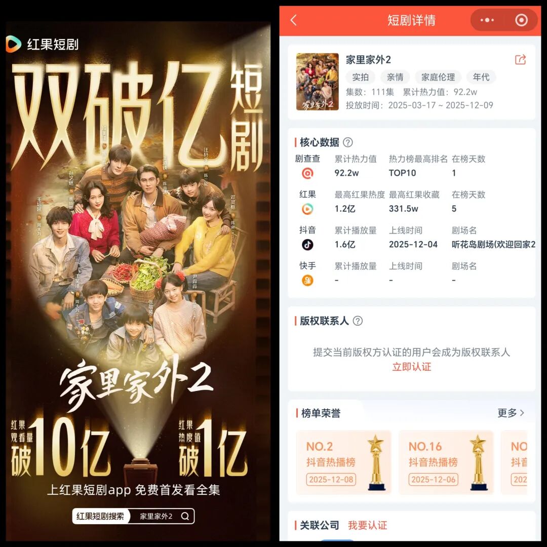 根据红果战报显示,截至12月8日,《家里家外2》在红果平台播放总量超10亿。此外,该短剧已经连续6天霸榜红果热度TOP1,日均红果热度也持续稳定维持在1亿以上!