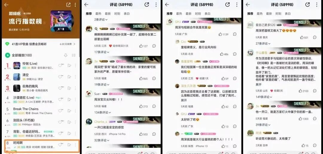 另一方面,歌手周深本身的许多作品就主打“温情治愈”的风格,其听众的用户画像与《家里家外》系列作品中的用户画像,有一定的重合度。短剧与音乐人的合作,不仅是用高品质OST来打开受众群体,让短剧行业有了新的受众群体,更是传递“温情治愈”的厂牌调性和短剧风格。当用户听到《时间啊》就联想到《家里家外》的温情故事,也是短剧内容对观众的又一次触动。