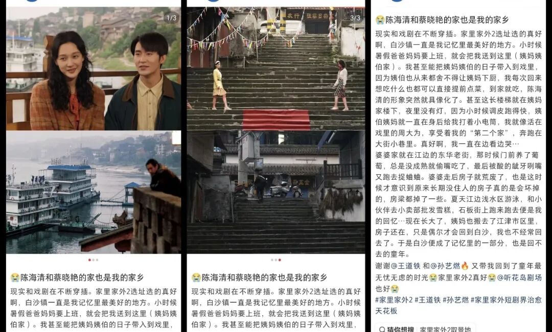 《家里家外》IP的延伸不仅局限于线上的联动,更是被观众自发开辟了线下“拍摄地巡礼”的新玩法。DataEye短剧观察发现,《家里家外2》开播后,不仅有网友在社交媒体平台分享观看体验、进行二创,更有不少观众自发开展线下打卡。这种线下互动让《家里家外》不再只是一部虚构的短剧,而是成为了承载大众“家情怀”的载体,进一步强化了IP与观众之间的情感联结。
