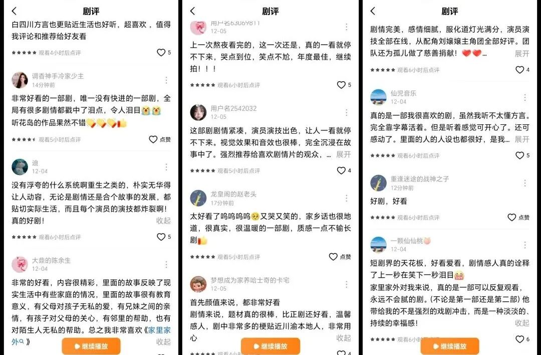 短剧市场的情感赛道正逐步拓宽,从以往单一的爱情题材,延伸到亲情、友情等多元情感类型,这类作品凭借真挚的情感表达收获了大量观众的共鸣。而《家里家外2》本身也可看作“温情家庭+群像”的典型,让更多创作者看到了温情群像这一细分题材的潜力。
