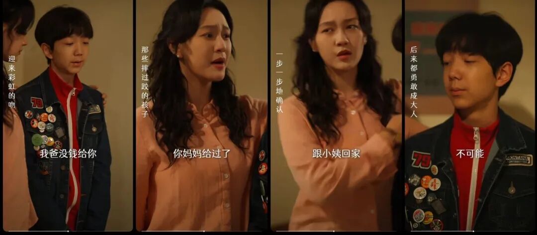 对于细节的处理不仅在于美术道具上,还在于视听语言的处理。从视听语言来看,镜头的设计也暗藏着导演的许多巧思,例如在蔡晓艳和姐姐的“撕布比赛”的情节镜头中,导演巧妙地利用墙上的柱子做画面分割,墙上的年代感“大字报”的红与黑,热情与消极,恰好隐射出姐妹两人的性格反差。