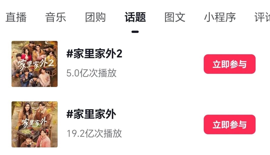 此外,“家里家外2”相关话题在小红书阅读量达3241.7万、抖音话题#家里家外2 播放量达5.0亿次播放量。剧中的亲情名场面、经典台词被大量剪辑传播,触达更广泛的用户群体。