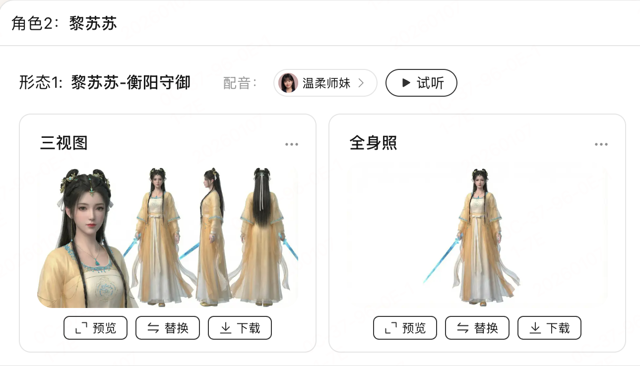 第三,人物资产创作。在AI创作人物只能依靠提示词的大背景下,纳米漫剧流水线能给每个角色建立空间级的三视图,通过正面、侧面、背面三个角度的视觉参考,让角色在跨镜头、跨剧集的情况下都能保持一致性。